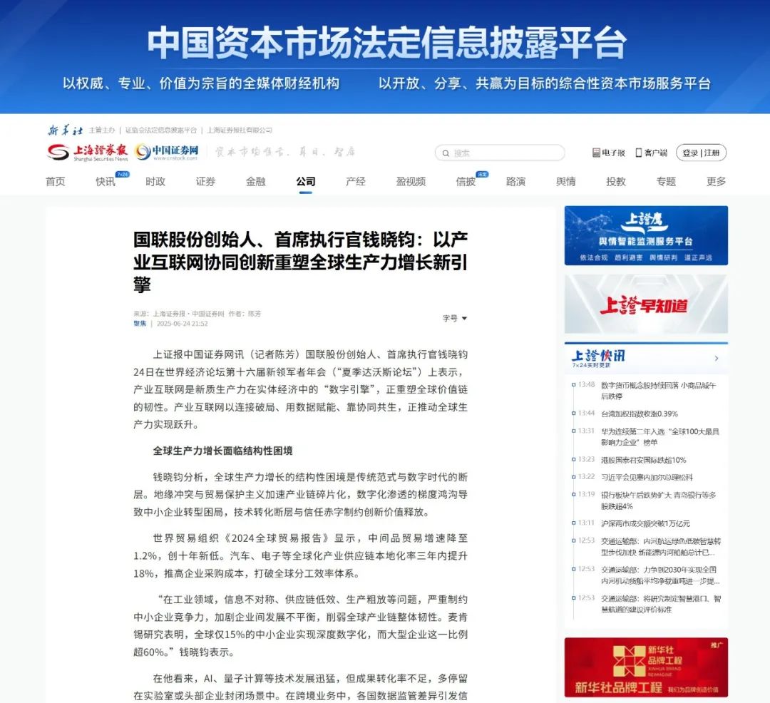 Shanghai Securities News, China Securities Network (Reporter Chen Fang) - IBI Founder and CEO Qian Xiaojun stated at the 16th Annual Meeting of the New Champions of the World Economic Forum ("Summer Davos Forum") on the 24th that the industrial internet serves as the "digital engine" for new productive forces in the real economy, reshaping the resilience of the global value chain. Through connectivity to break barriers, data empowerment, and symbiotic collaboration, the industrial internet is driving a leap in global productivity.