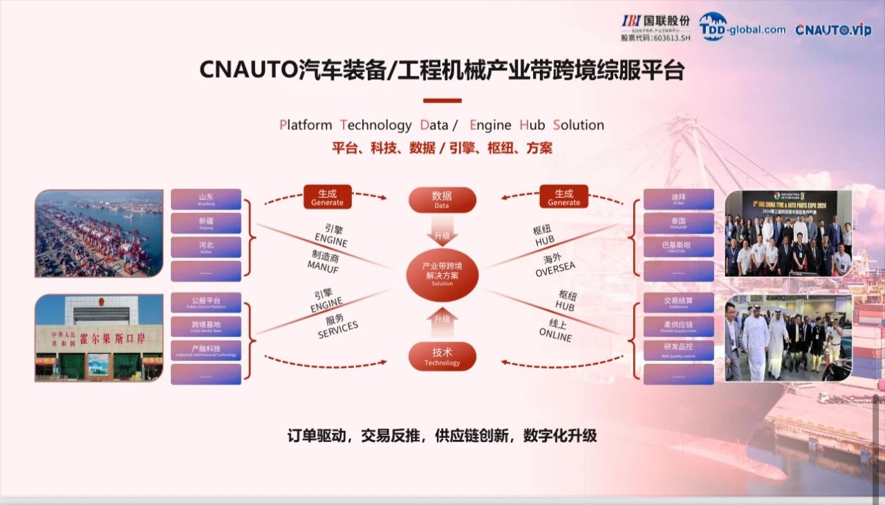 CNAUTO is IBI’s cross-border digital service platform for the vertical automotive equipment and construction machinery industry chain. It adopts a dual-driven approach of “New Industrial Cross-border Channel + AI Digital Infrastructure” to provide one-stop industrial cross-border solutions. The platform targets industry clusters such as rubber, tires, complete vehicles, and construction machinery, relying on the IBI “Platform, Technology, Data” strategy, connecting domestic free trade zones such as Qingdao, Urumqi, and Chongqing with overseas hubs in Middle East/Africa and Southeast Asia. It creates a cross-border ecosystem of “Domestic Base + Overseas Center + Digital Services.” By building AI big data models online (for tax rebates, marketing, compliance, etc.), developing cross-border new channel platforms and financing technology platforms, and establishing offline overseas warehouses and transaction centers in Middle East/Africa, CNAUTO achieves global distributed collaboration, facilitating industrial clusters to “go abroad together” and empowering the globalization of Chinese manufacturing.