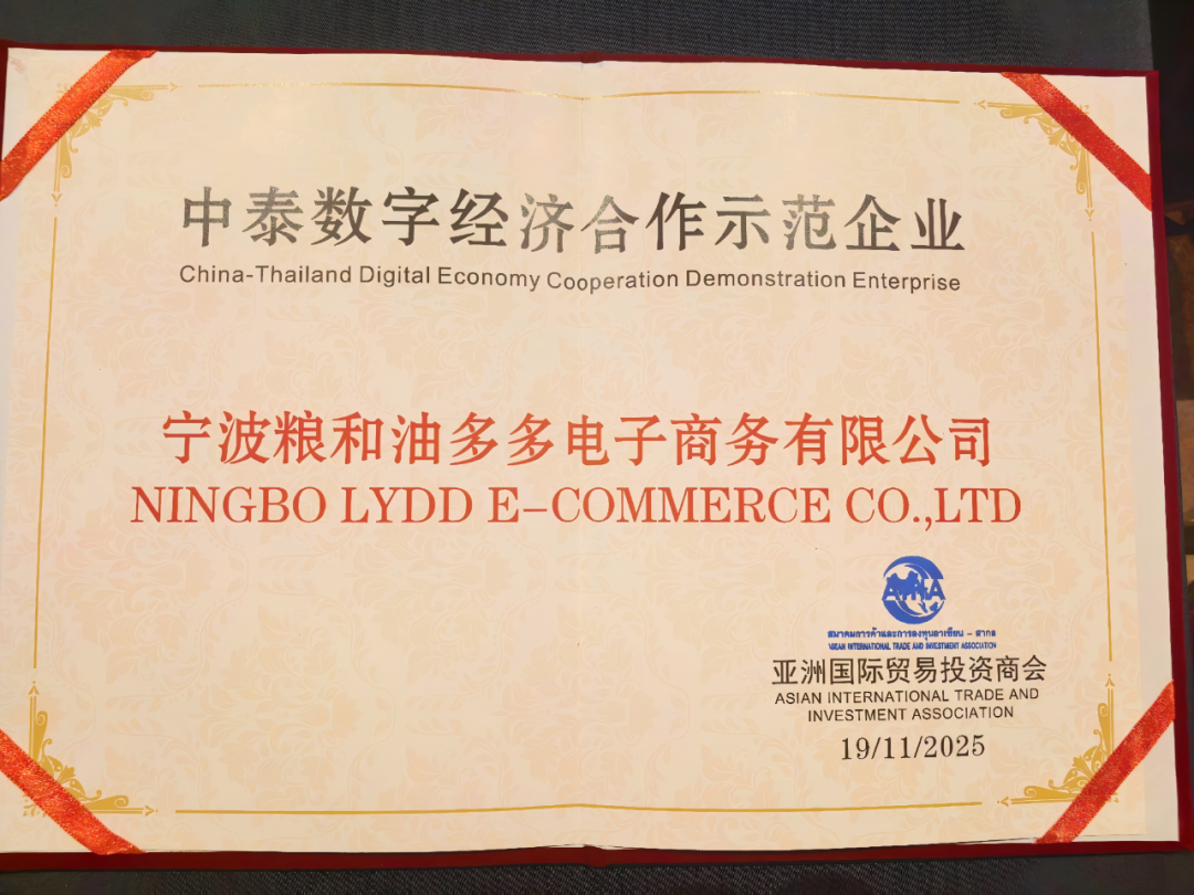 After the meeting, Chamaiporn Chuecharoen, Honorary President of the Asia International Trade and Investment Chamber, presented an "Exemplary China-Thailand Digital Economy Enterprise" honorary certificate to LYDD as the award presenter. Zhang Li, Vice President of LYDD's Strategic Development Department, went on stage to accept the award on behalf of the company.