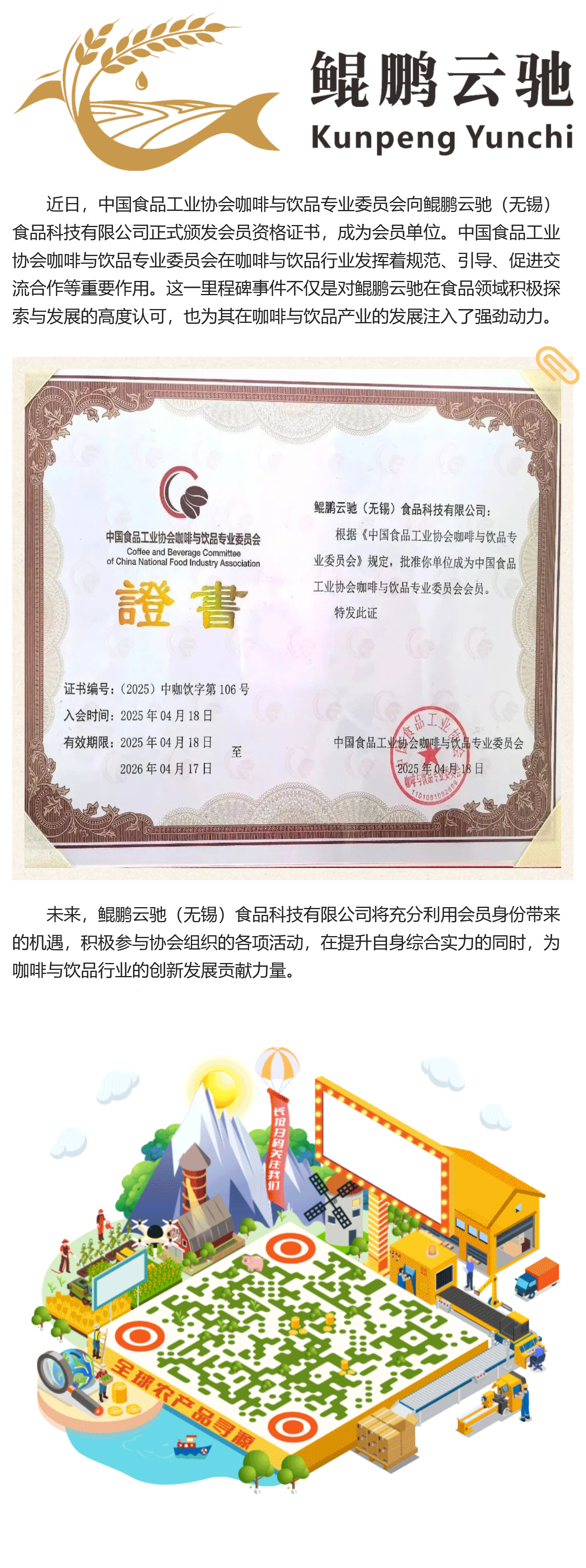 Warm congratulations to Kunpeng Yunchi (Wuxi) Food Technology Co., Ltd. on officially joining the Coffee and Beverage Professional Committee of the China Food Industry Association!