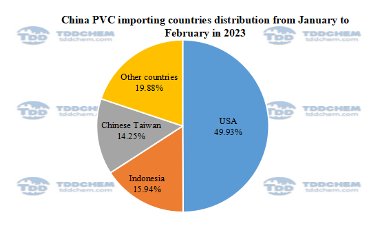 Analysis on the Import Source Countries: According to the latest statistical data, from January to February in 2023, China’s total import of PVC from the United States was 49275.15 tons, accounting for 49.93% of the total import volume. China imported 15734 tons from Indonesia, accounting for 15.94% of the total import volume. China imported 71,132.557 tons from Chinese Taiwan, accounting for 14.25% of the total import volume.